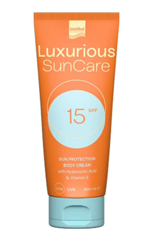 Η Luxurious Sun Care Body Cream Spf15 με υαλουρονικό οξύ, βιταμίνη Ε και ειδικό συνδυασμό UV φίλτρων, ενυδατώνει και αναπλάθει την επιδερμίδα.