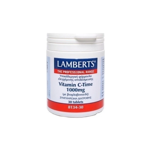 To σκεύασμα Vitamin C Time Release 1000mg της Lamberts παρέχει εγγυημένα 1000mg Βιταμίνης C σε δισκία ελεγχόμενης αποδέσμευσης και μία σημαντική ποσότητα βιοφλαβονοειδών (ρουτίνη, κερσετίνη, κιτρίνη και εσπεριδίνη)τα οποία συμβάλλουν στην απορρόφησή της από τον οργανισμό και σκόνη καρπών αγριοτριανταφυλλιάς (Rose Hips). Όπως όλα τα σκευάσματα της Lamberts, παρασκευάζεται εντός του Ηνωμένου Βασιλείου σύμφωνα με τα αυστηρά πρότυπα της Φαρμακευτικής GMP (Pharmaceutical GMP).