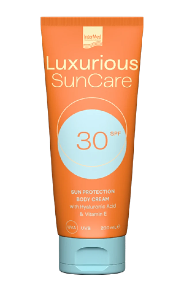 Η Luxurious Sun Care Body Cream SPF30 με υαλουρονικό οξύ, βιταμίνη Ε και ειδικό συνδυασμό UV φίλτρων, ενυδατώνει και αναπλάθει την επιδερμίδα.