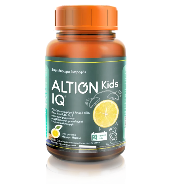 Το Altion Kids IQ είναι συμπλήρωμα διατροφής ειδικά σχεδιασμένο για παιδιά με υπέροχη γεύση λεμόνι. Το Altion Kids IQ είναι ζελεδάκια πλούσια σε Ω3 λιπαρά οξέα φυτικής προέλευσης από έλαιο λιναρόσπορου, βιταμίνες (A, E, B5, B6) και ψευδάργυρο. Το Altion Kids IQ περιέχει βιταμίνη Β5, η οποία συμβάλλει στη φυσιολογική νοητική επίδοση και βιταμίνη Β6 που συμβάλλει στη φυσιολογική λειτουργία του νευρικού συστήματος.