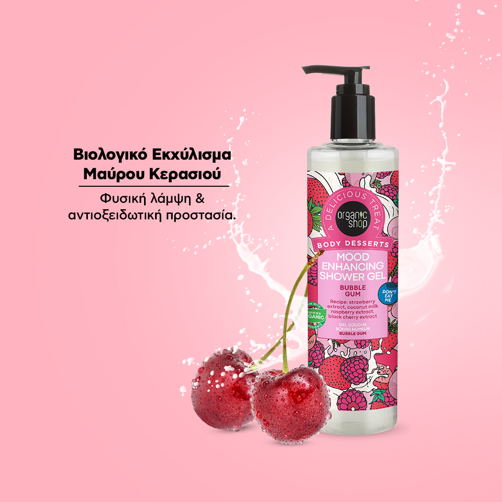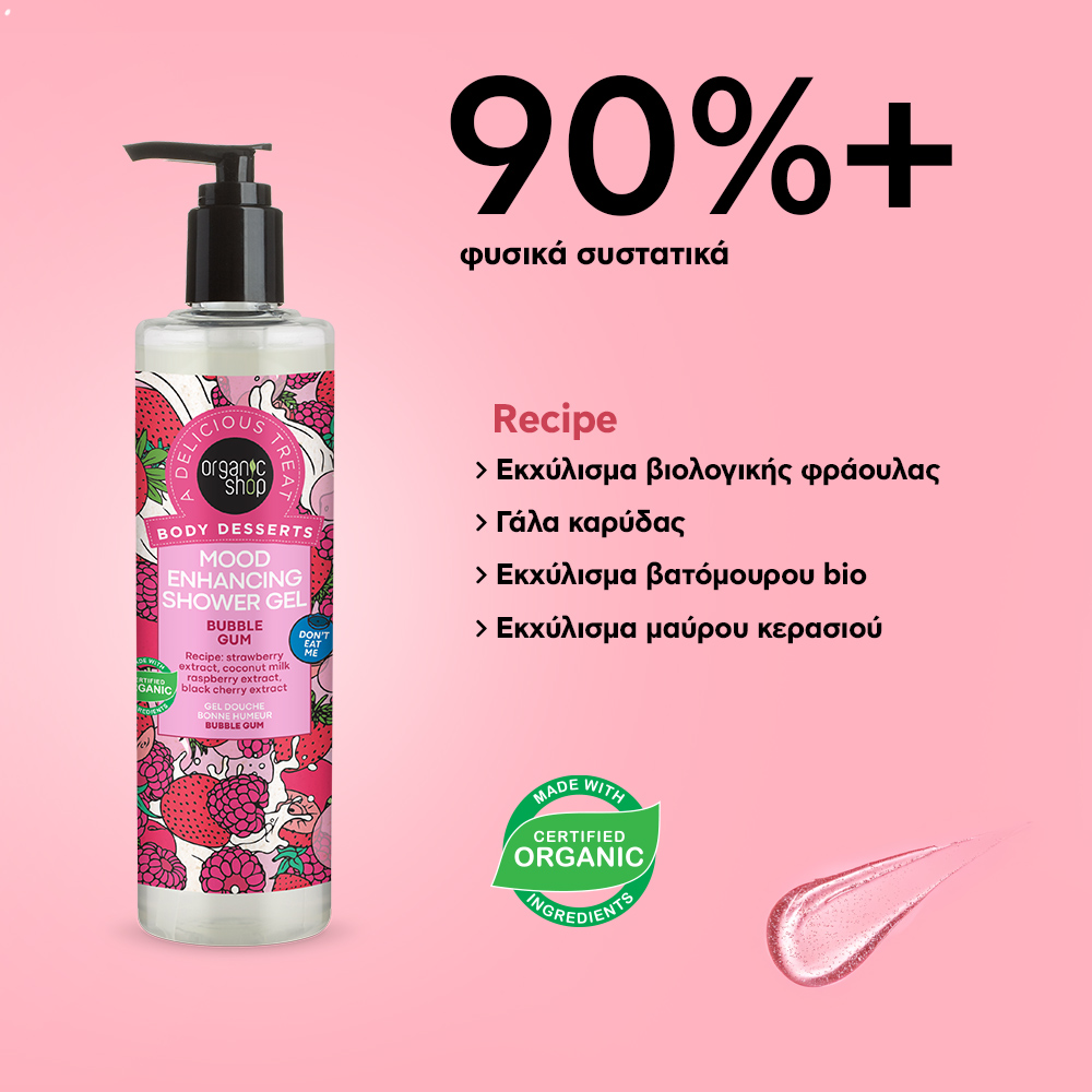 Organic Shop Body Desserts Bubble Gum Mood Enhancing Shower Gel Αναζωογονητικό Αφρόλουτρο με Εκχύλισμα Φράουλας, Μαύρου Κερασιού, Βατόμουρου & Έλαιο Καρύδας για Δέρμα Μεταξένιο & Σφριγηλό με Αντλία 280ml