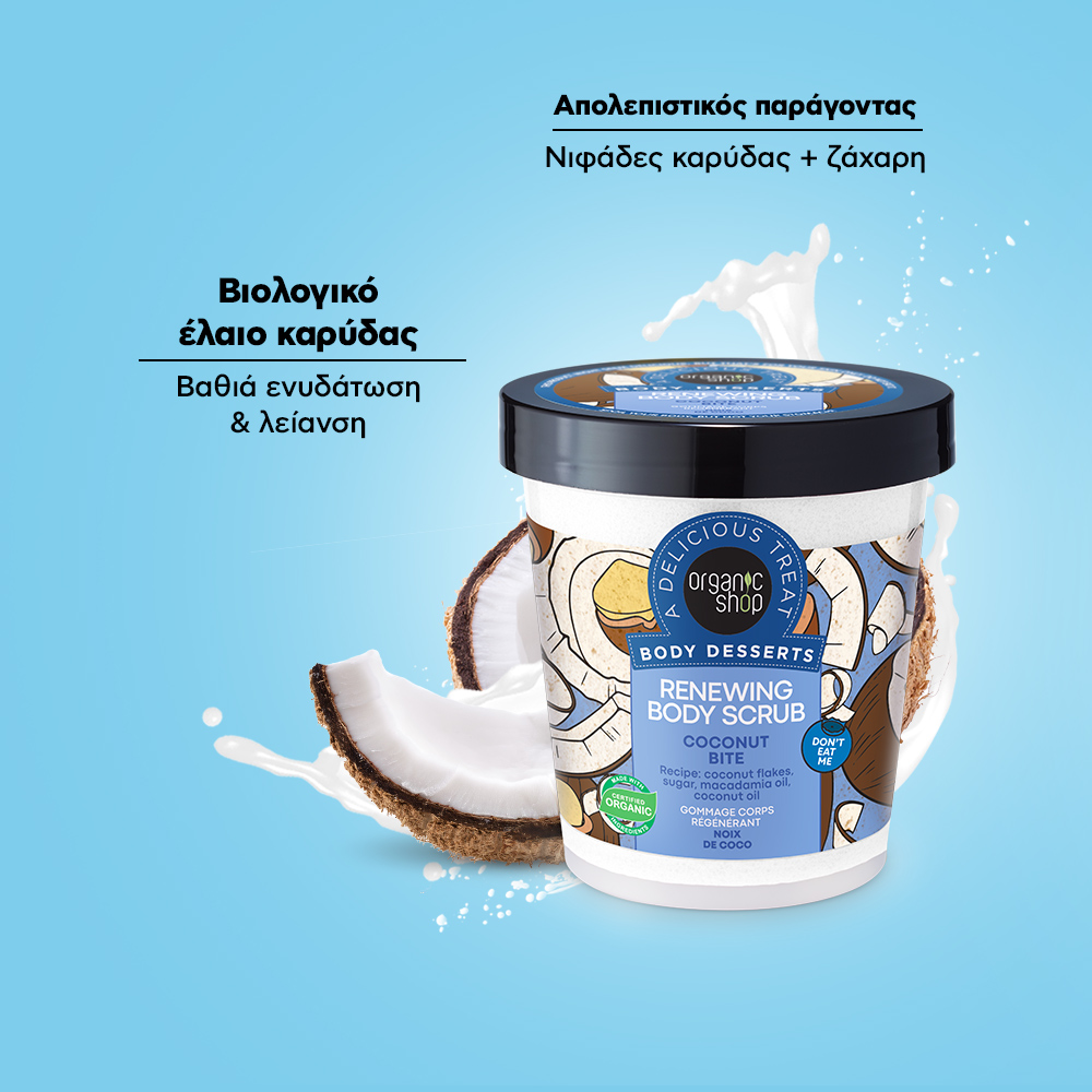 Organic Shop Body Desserts Coconut Bite Renewing Body Scrub Απολεπιστικό Σώματος Ανανέωσης με Νιφάδες Καρύδας & Ζάχαρης για Ελαστικό & Μεταξένιο Δέρμα 450ml