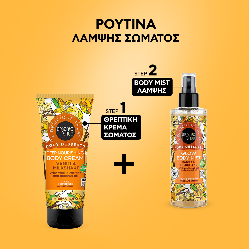 Organic Shop Body Desserts Vanilla Milkshake Deep Nourishing Body Cream Ενυδατική Κρέμα Σώματος με Εκχύλισμα Βανίλιας & Έλαιο Καρύδας με Γλυκό Άρωμα Milkshake 150ml