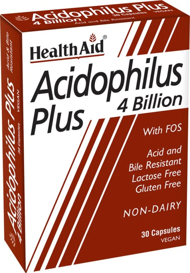 Το Acidophilus Plus της Health Aid αποτελεί συνδυασμό 3 προβιοτικών στελεχών (Lactobacillus Acidophilus, Lactobacillus Bulgaricus, Bifidobacterium Lactis), σε ποσότητα 4 δισεκατομμυρίων/κάψουλα, μαζί με πρεβιοτικά (FOS) για μέγιστο αποτέλεσμα.
