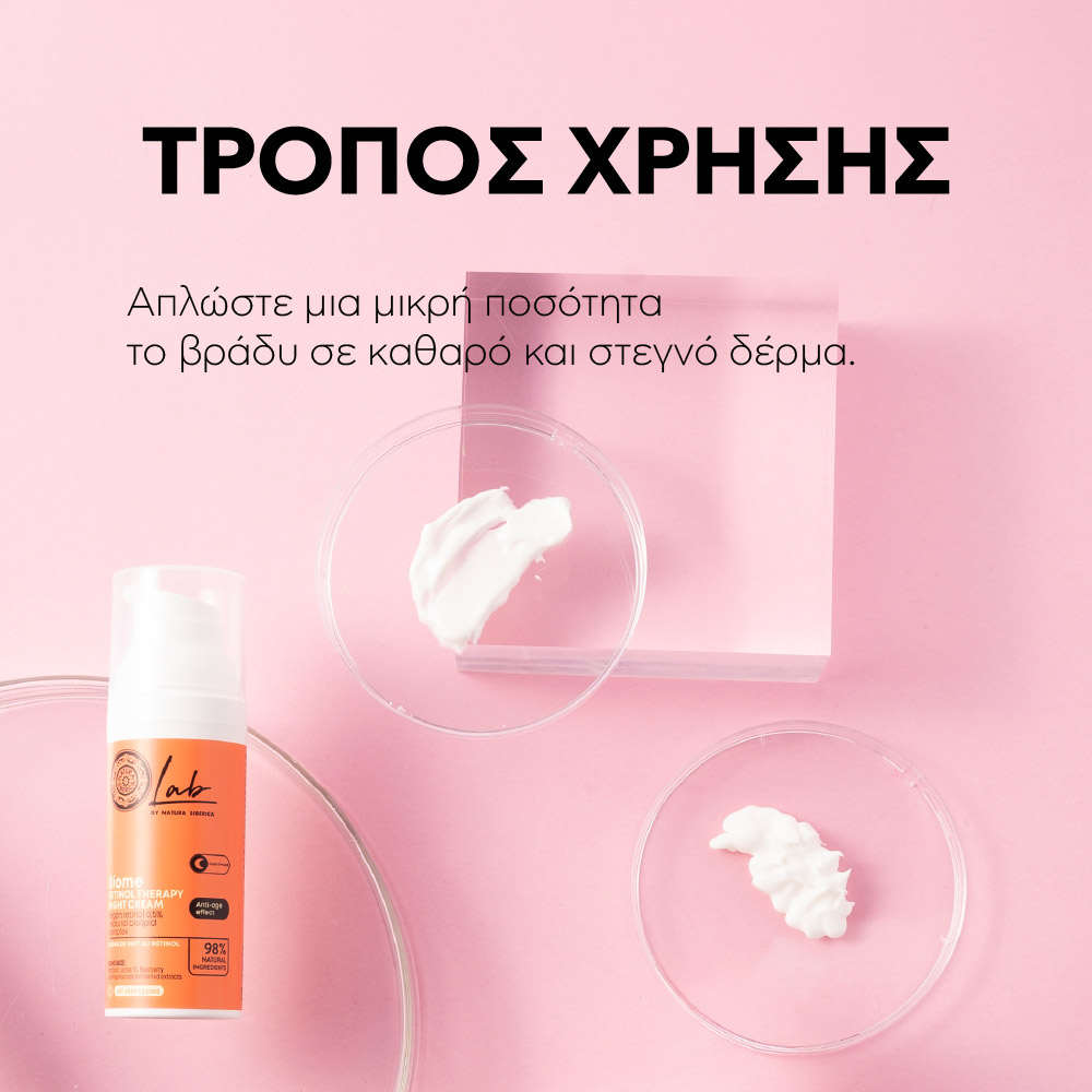 Ανακάλυψε τη Κρέμα Νυκτός Lab Biome με Ρετινόλη, 50ml, την ιδανική επιλογή για να χαρίσεις στη περιποίηση προσώπου σου εντατική φροντίδα και αναζωογόνηση κατά τη διάρκεια της νύχτας. Ανήκοντας στη νέα γενιά από καινοτόμες κρέμες νυκτός, η σύνθεσή της αξιοποιεί τη δύναμη της σειράς Lab Biome της Natura Siberica, που έχει σχεδιαστεί για να υποστηρίζει το μικροβίωμα του δέρματος και να χαρίζει φρέσκια, νεανική όψη κάθε πρωί.