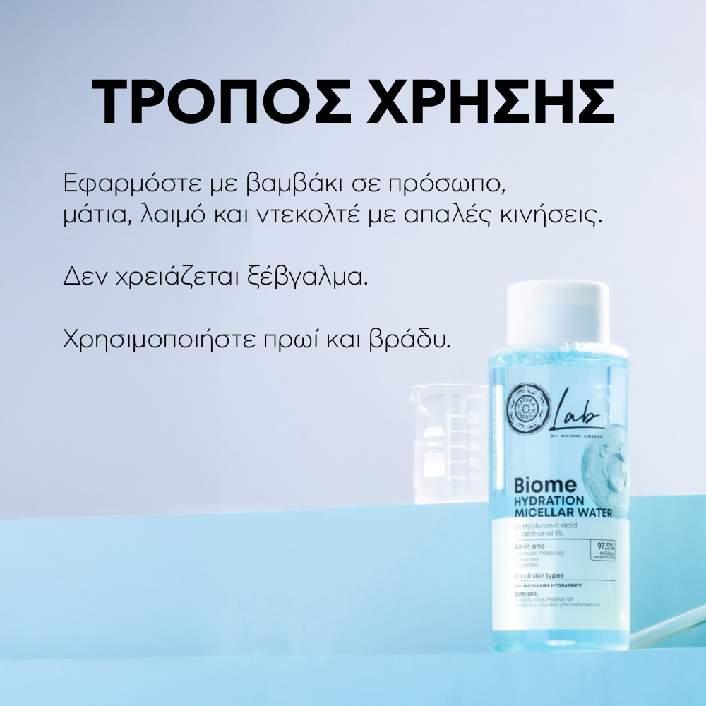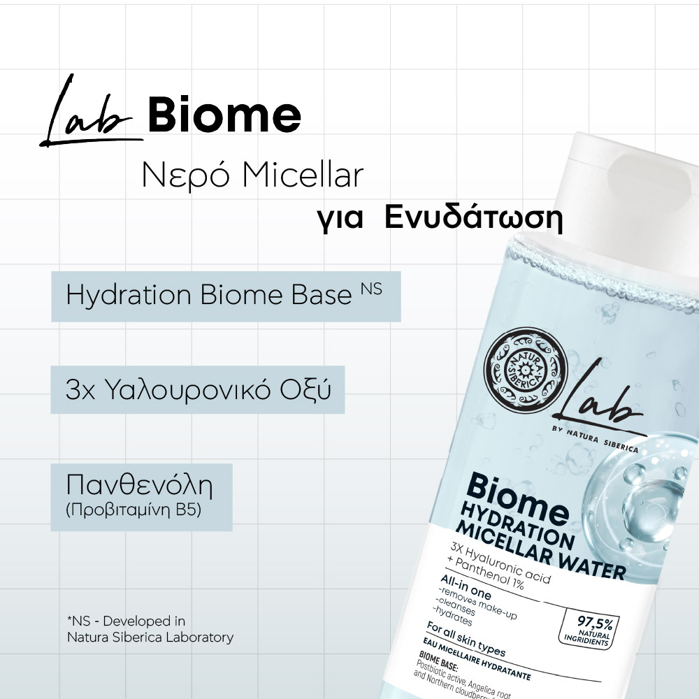 Το Νερό Micellar Ενυδάτωσης Lab Biome της Natura Siberica είναι το ιδανικό all-in-one προϊόν περιποίησης προσώπου για καθαρισμό, ενυδάτωση και φρεσκάδα σε κάθε χρήση.
