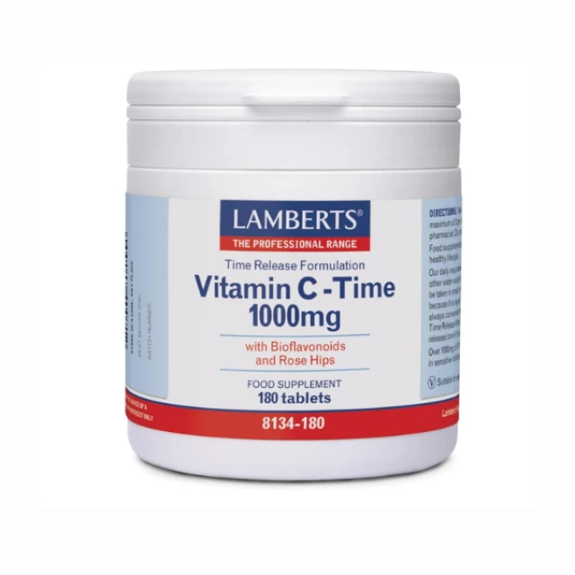 To σκεύασμα Vitamin C Time Release 1000mg της Lamberts παρέχει εγγυημένα 1000mg Βιταμίνης C σε δισκία ελεγχόμενης αποδέσμευσης και μία σημαντική ποσότητα βιοφλαβονοειδών (ρουτίνη, κερσετίνη, κιτρίνη και εσπεριδίνη)τα οποία συμβάλλουν στην απορρόφησή της από τον οργανισμό και σκόνη καρπών αγριοτριανταφυλλιάς (Rose Hips). Όπως όλα τα σκευάσματα της Lamberts, παρασκευάζεται εντός του Ηνωμένου Βασιλείου σύμφωνα με τα αυστηρά πρότυπα της Φαρμακευτικής GMP (Pharmaceutical GMP).