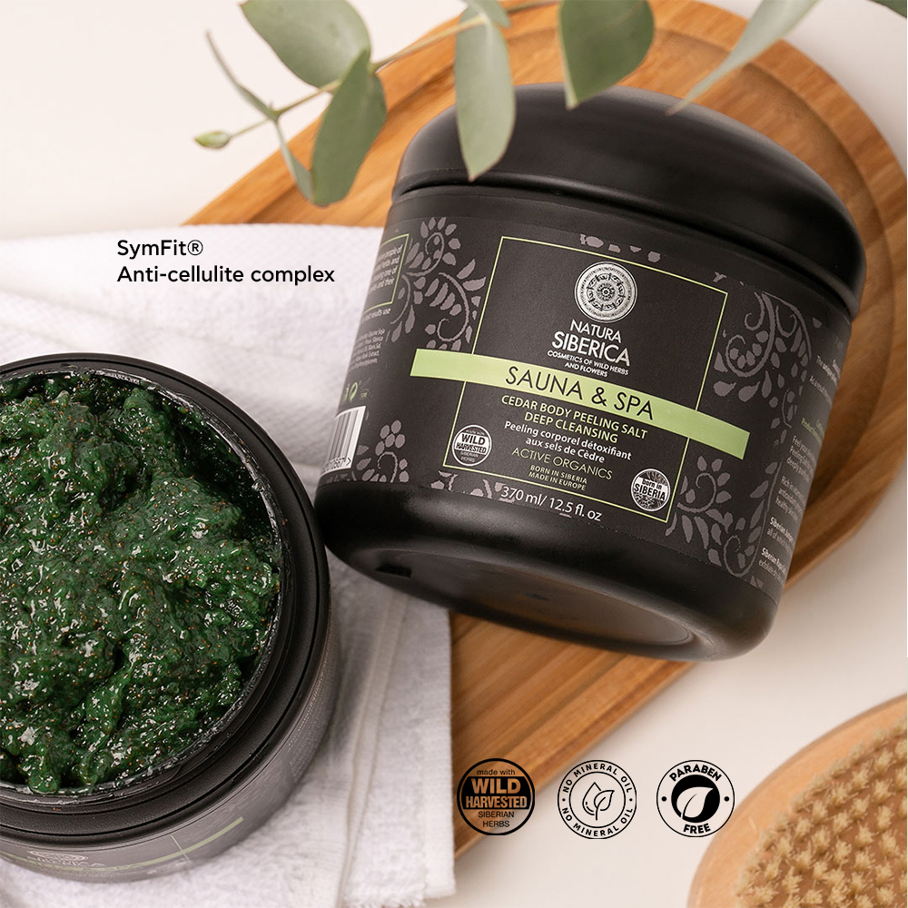 Η μοναδική φόρμουλα του Cedar Peeling Salt συνδυάζει άγριας συγκομιδής βότανα Σιβηρίας και φυσικά άλατα, δημιουργώντας μία θεραπευτική εμπειρία απολέπισης που αποκαλύπτει πιο απαλή, ελαστική και υγιή επιδερμίδα. Με μέγιστη περιεκτικότητα σε βοτανικά συστατικά, το προϊόν προσφέρει τόνωση και σύσφιγξη, ενώ τα αιθέρια έλαια χαρίζουν αρωματοθεραπευτική δράση που αναζωογονεί σώμα και πνεύμα.