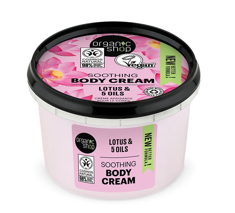Ανακάλυψε την Κρέμα Σώματος Organic Shop Basic με Lotus & 5 Έλαια, 250ml και χαρίστε στην επιδερμίδα σας την απόλυτη φροντίδα και αναζωογόνηση. Από τη σειρά Organic Shop Basic, αυτή η πλούσια κρέμα είναι φτιαγμένη με βιολογικό εκχύλισμα λωτού και πέντε εξαιρετικά βιολογικά έλαια – jojoba, νυχτολούλουδο, αμάραντο, γλυκό αμύγδαλο και βούτυρο καριτέ – για να αποκαταστήσει και να αναζωογονήσει την επιδερμίδα σας, αφήνοντάς την λείεια, απαλή και ενυδατωμένη.