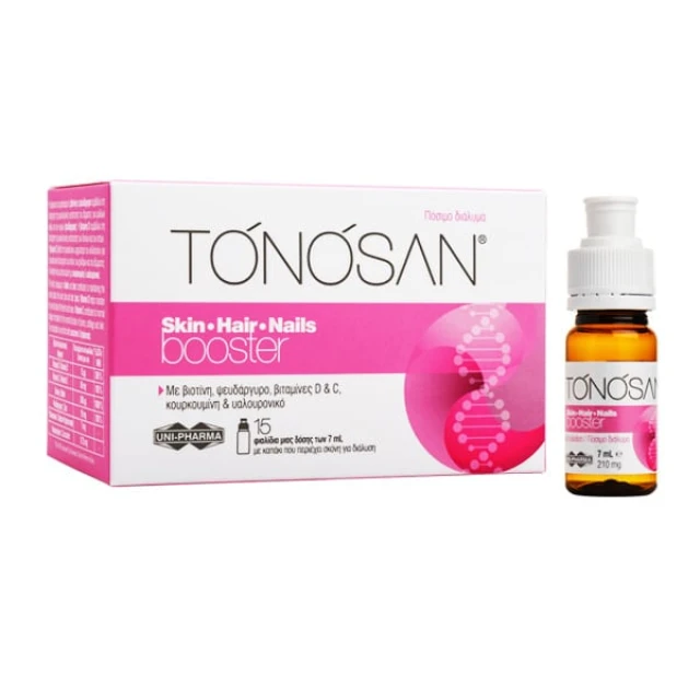 Το TONOSAN® Skin-Hair-Nails booster, χάρη στη βιοτίνη, τον ψευδάργυρο και τη βιταμίνη C, προάγει την παραγωγή κολλαγόνου και κερατίνης, με αποτέλεσμα τη νεανική & φωτεινή όψη του δέρματος, τα υγιή και λαμπερά μαλλιά καθώς και τον σχηματισμό δυνατών και γερών νυχιών.
