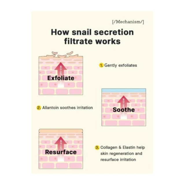 Snail Secretion Filtrate, Betaine, Caprylic/Capric Triglyceride, Butylene Glycol, Cetearyl Olivate, Sorbitan Olivate, Cetearyl Alcohol, Carbomer, Ethyl Hexanediol, Phenoxyethanol, Arginine, Dimethicone, Sodium Polyacrylate, Sodium Hyaluronate,Allantoin, Palmitic Acid, Panthenol, Xanthan Gum, Stearic acid, Adenosine, Water, Myristic Acid