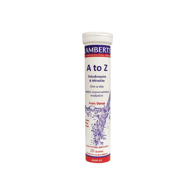 Η πολυβιταμίνη A to Z της Lamberts είναι μία φόρμουλα ενός αναβράζον δισκίου ημερησίως το οποίο παρέχει σχεδόν όλα τα απαραίτητα μικροθρεπτικά συστατικά, πολλά εκ των οποίων στο 100% του RDA ( Συνιστώμενης Ημερήσιας Δόσης ). Αποτελεί ένα συμπλήρωμα διατροφής, το οποίο παρέχει επίπεδα μικροθρεπτικών συστατικών με στόχο τη συντήρησή τους και συνίσταται για ηλικίες άνω των 13 ετών.![]()