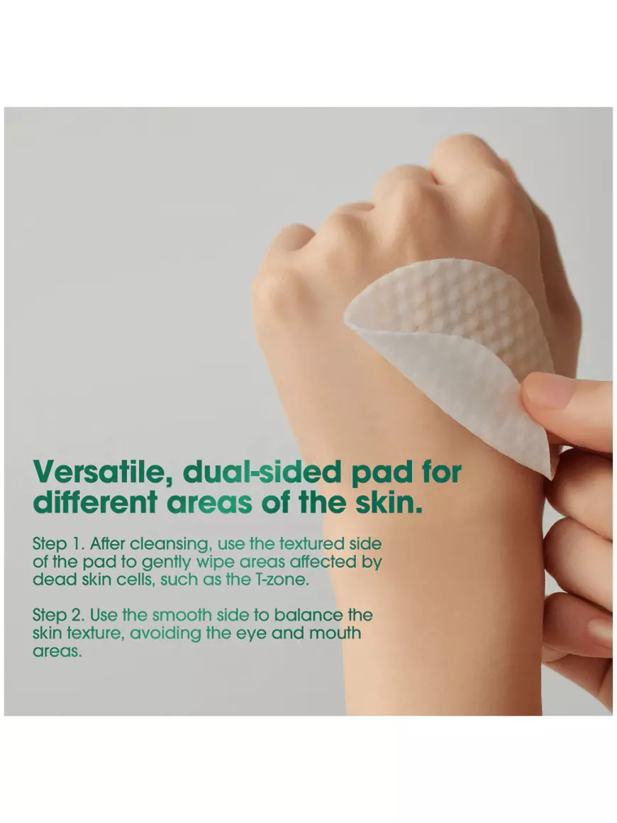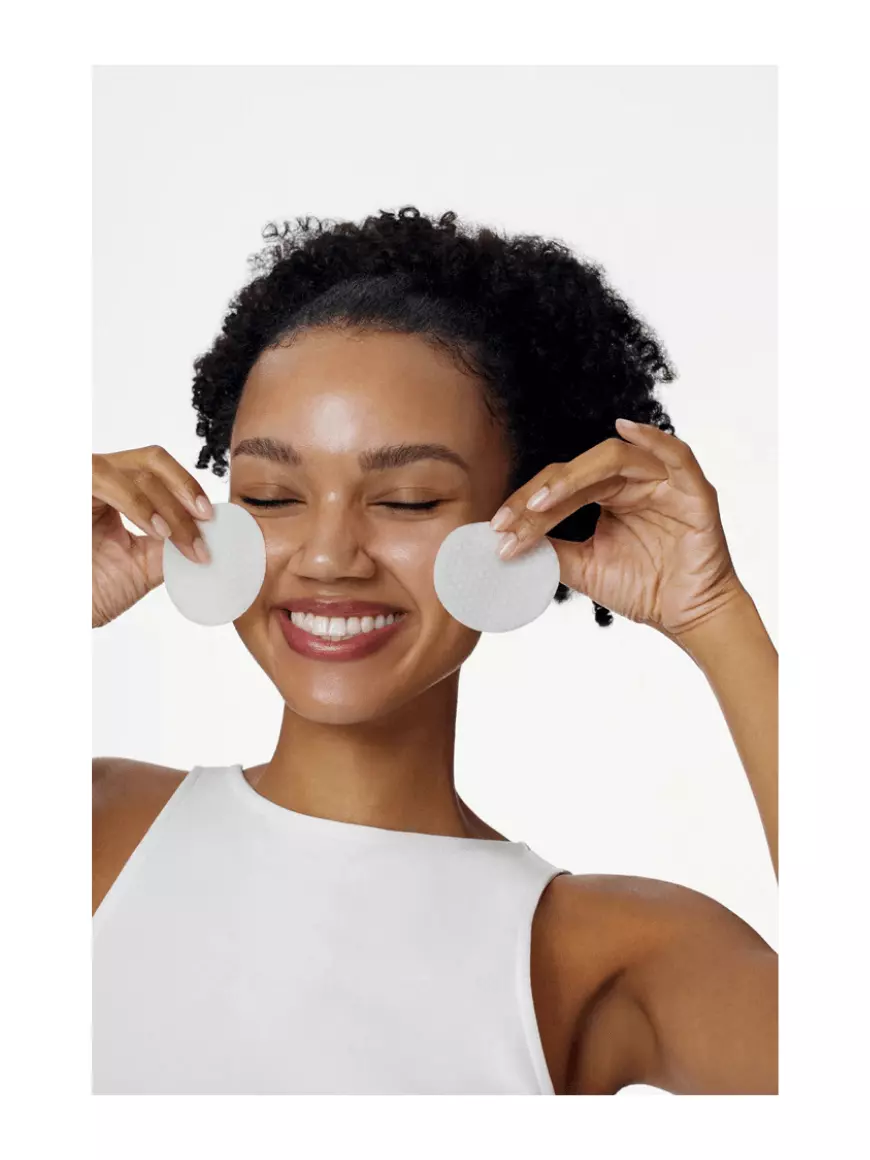 Μετά τον καθαρισμό σε στεγνή επιδερμίδα, χρησιμοποιήστε την τραχιά πλευρά του επιθέματος για να σκουπίσετε απαλά το πρόσωπο, το λαιμό και το ντεκολτέ, αποφεύγοντας την περιοχή των ματιών.