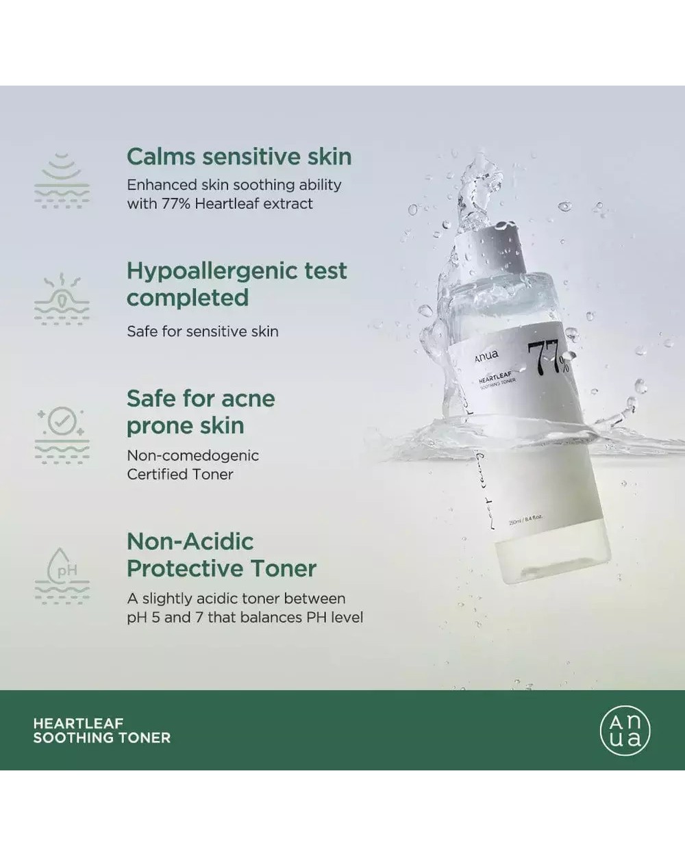 Περιέχει ισχυρή συγκέντρωση 77% εκχυλίσματος Heartleaf, ένα συστατικό γνωστό για τις καταπραϋντικές του ιδιότητες. Με ένα ελαφρώς όξινο pH που κυμαίνεται από 5,5 έως 6, αυτό το τόνερ βοηθά στη βελτιστοποίηση της ισορροπίας λιπαρότητας και υγρασίας του δέρματός σας.