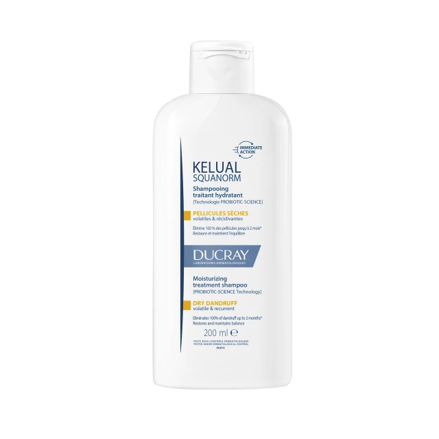 Το ενυδατικό σαμπουάν θεραπείας KELUAL SQUANORM, ειδικά προσαρμοσμένο για την καταπολέμηση της ξηρής πιτυρίδας, αντιπροσωπεύει την πρώτη γενιά σαμπουάν υψηλής απόδοσης κατά της πιτυρίδας, εμπνευσμένο από τις ευεργετικές και παρατεταμένες επιδράσεις των προβιοτικών. Χάρη στην τεχνολογία PROBIOTIC-SCIENCE, εξαλείφει απαλά το 100% της ορατής πιτυρίδας από την 1η εφαρμογή*. ενώ αποτρέπει την επανεμφάνισή τους αποτελεσματικά για 2 μήνες**. Αποκτήστε ένα υγιές, ενυδατωμένο και άνετο τριχωτό της κεφαλής με 1 μόνο λούσιμο*.