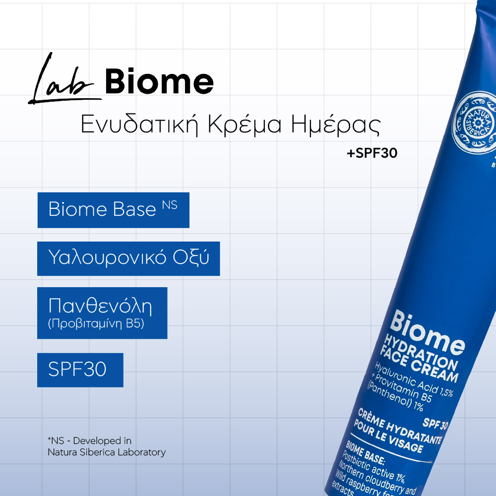 Αν αναζητάς μια Κρέμα Προσώπου που ενυδατώνει, προστατεύει και διατηρεί τη λάμψη και τη νεανικότητα της επιδερμίδας σου, η Ενυδατική Κρέμα Ημέρας με SPF30 Lab Biome, είναι η ιδανική επιλογή!