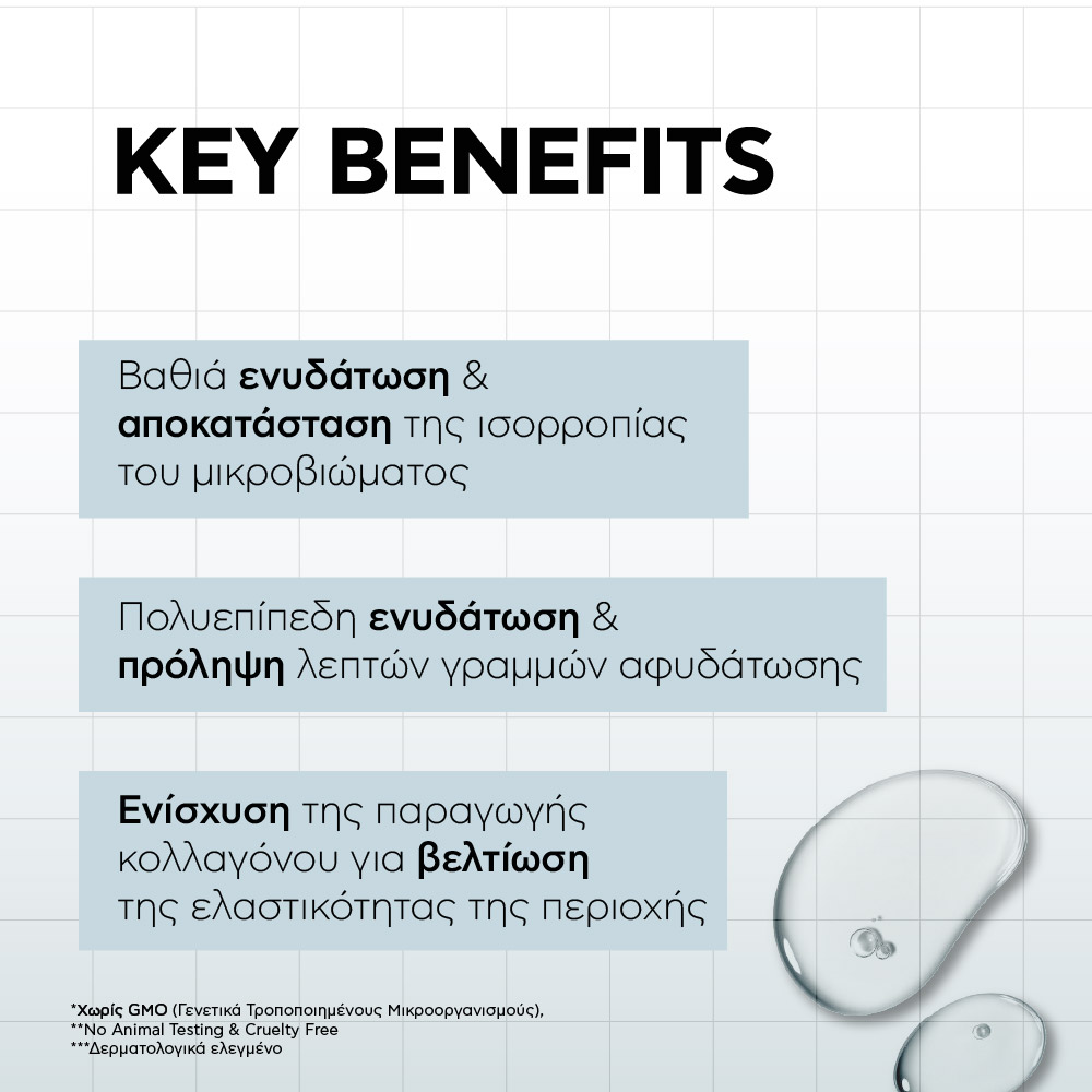 Η φόρμουλα του προϊόντος βασίζεται στην προηγμένη τεχνολογία Hydration Biome Base NS, που συνδυάζει Σιβηρικό Cloudberry, εκχυλίσματα Αγγελικής Ρίζας που έχουν υποστεί ζύμωση και Ενεργά Μεταβιοτικά 1%. Ο μοναδικός αυτός συνδυασμός προσφέρει βαθιά ενυδάτωση, αποκαθιστά τη φυσική ισορροπία του μικροβιώματος και συμβάλλει στη διατήρηση της ανθεκτικότητας και της ελαστικότητας του δέρματος γύρω από τα μάτια.