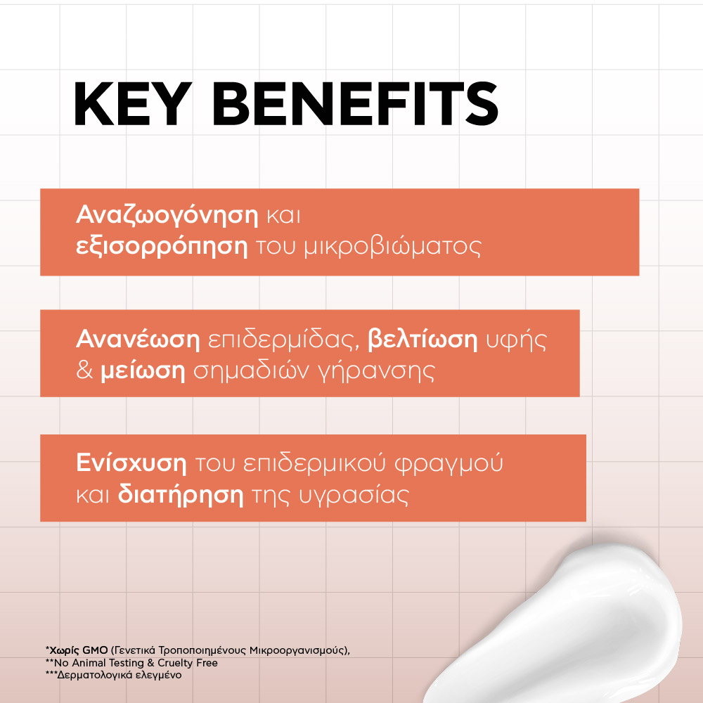 | FREE OF | Χωρίς GMO (Γενετικά Τροποποιημένους Μικροοργανισμούς), No Animal Testing & Cruelty Free |