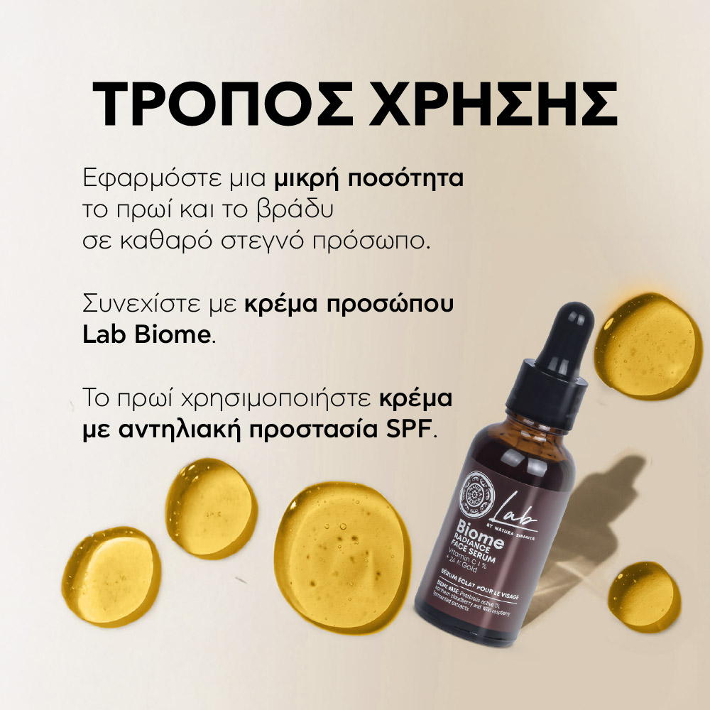 Εφαρμόστε μια μικρή ποσότητα το πρωί και το βράδυ σε καθαρό στεγνό πρόσωπο. Συνεχίστε με κρέμα προσώπου Biome. Το πρωί χρησιμοποιήστε κρέμα με αντηλιακή προστασία SPF.