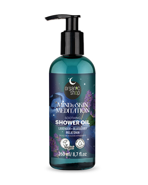 Το Χαλαρωτικό Λάδι Ντους Mind & Skin Meditation είναι ένα υδρόφιλο λάδι που μεταμορφώνεται σε πλούσιο, κρεμώδη αφρό μόλις έρθει σε επαφή με το νερό. Η μοναδική του σύνθεση με αιθέριο έλαιο λεβάντας, εκχύλισμα blueberry και μελατονίνη θρέφει την επιδερμίδα και χαλαρώνει το σώμα και το πνεύμα. Το άρωμα λεβάντας καταπραΰνει τις αισθήσεις και μειώνει το στρες, ενώ η μελατονίνη ενισχύει τη φυσική διαδικασία χαλάρωσης του οργανισμού, προετοιμάζοντάς τον για έναν βαθύ, αναζωογονητικό ύπνο. Το blueberry, πλούσιο σε αντιοξειδωτικά, ενυδατώνει, αναζωογονεί και χαρίζει στο δέρμα υγιή λάμψη και απαλότητα.