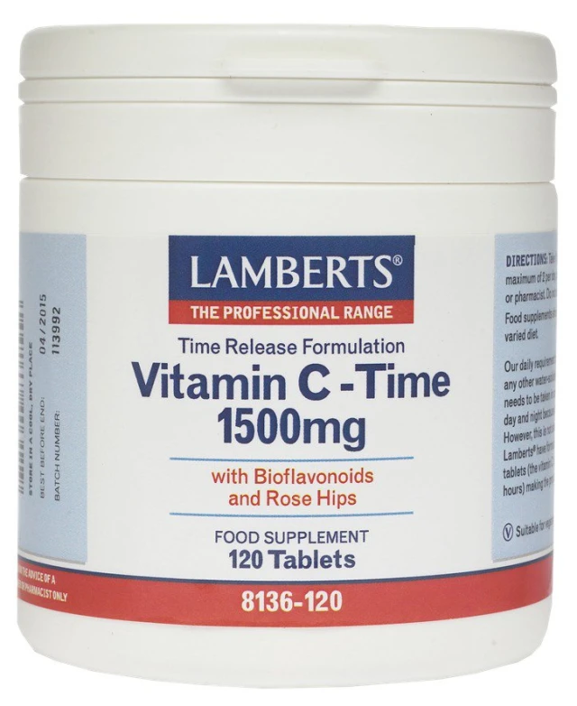 To σκεύασμα Vitamin C Time Release 1500mg της Lamberts παρέχει εγγυημένα 1500mg Βιταμίνης C σε δισκία ελεγχόμενης αποδέσμευσης και μία σημαντική ποσότητα βιοφλαβονοειδών (ρουτίνη, κερσετίνη, κιτρίνη και εσπεριδίνη) τα οποία συμβάλλουν στην απορρόφησή της από τον οργανισμό και σκόνη καρπών αγριοτριανταφυλλιάς (Rose Hips) . Όπως όλα τα σκευάσματα της Lamberts, παρασκευάζεται εντός του Ηνωμένου Βασιλείου σύμφωνα με τα αυστηρά πρότυπα της Φαρμακευτικής GMP (Pharmaceutical GMP).