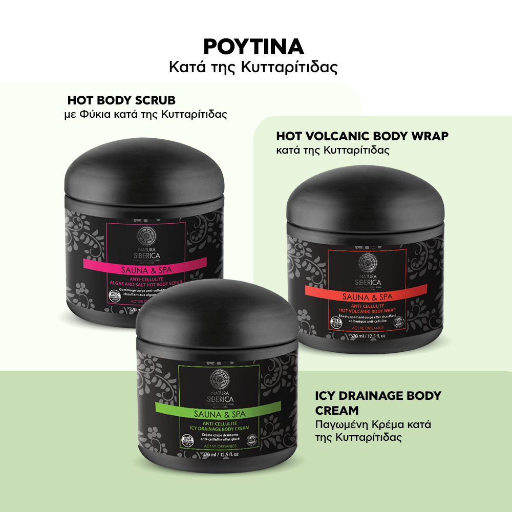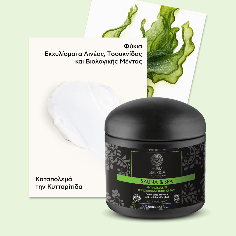 Ανακάλυψε την Κρέμα Σώματος Sauna & Spa Icy Drainage κατά της κυτταρίτιδας, 370ml, μια καινοτόμα θεραπεία σώματος της Natura Siberica, από τη σειρά Sauna & Spa, που προσφέρει δροσιά, τόνωση και ορατή βελτίωση της όψης της επιδερμίδας. Εμπνευσμένη από τα παραδοσιακά σιβηρικά τελετουργικά ευεξίας, αυτή η κρέμα δημιουργεί το αίσθημα «πάγου» πάνω στο δέρμα, καταπολεμώντας την κυτταρίτιδα και συμβάλλοντας στη λείανση και σύσφιξη της επιδερμίδας.