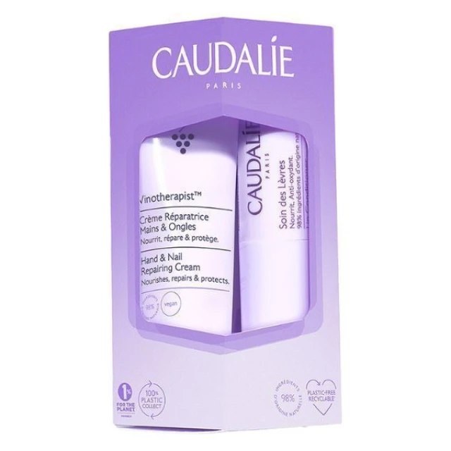 Caudalie Vinotherapist Nourishing Hand & Nail Ceam Ενυδατική & Επανορθωτική Κρέμα Χεριών & Νυχιών για Ξηρό Δέρμα 30mlΈλαιο σταφυλιού : 100% φυσικό, βιολογικό και ψυχρής έκθλιψης, είναι φυσικά θρεπτικό και αντιοξειδωτικό.Βιολογικό βούτυρο καριτέ : 100% φυσικό, βιολογικό και παράγεται βιώσιμα στη Μπουρκίνα Φάσο από έναν γυναικείο συνεταιρισμό, θρέφει, αναπλάθει και επανορθώνει το ξηρό δέρμα.Πολυφαινόλες : Εκχυλίσματα γαλλικού σπόρων σταφυλιού που είναι αντιοξειδωτικά και μπλοκάρουν το 100% των ελεύθερων ριζών.Caudalie Lip Conditioner Ενυδατικό Stick Χειλιών 4.5gΈλαιο σπόρου σταφυλιού: με αντιοξειδωτική και θρεπτική δράση.Shea butter: με ενυδατικές και μαλακτικές ιδιότητες.Έλαιο βερίκοκου: με μαλακτικές ιδιότητες για το ξηρό δέρμα.Πολυφαινόλες: με αντιοξειδωτική δράση.