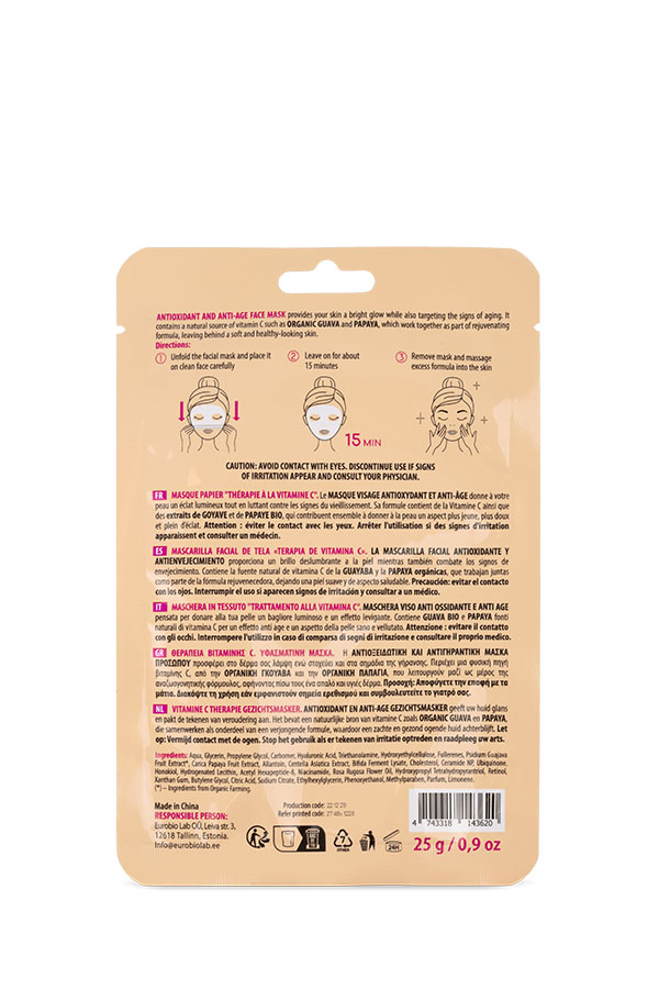 Organic Shop Vitamin C Therapy Antioxidant & Anti Age Sheet Mask Υφασμάτινη Μάσκα Προσώπου με Βιταμίνη C, Γκουάβα & Παπάγια για Αντιγήρανση με Αντιοξειδωτική Δράση 1 Τεμάχιο